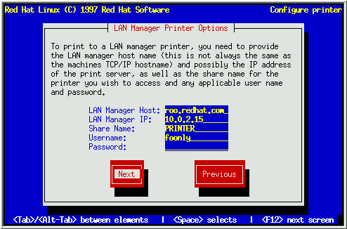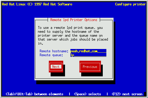 在'Remote hostname'域输入打印机直接连接的计算机的名称. 在'remote queue'域 输入远程打印机连接在远程计算机上的队列名. 选择Next, 并按 [Space]. 现在跳到第5.6.4节继续.