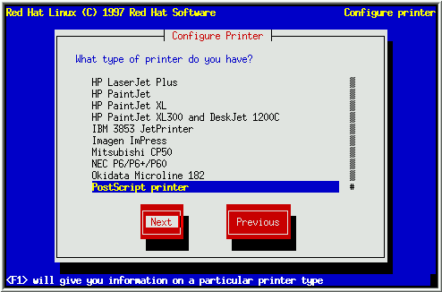 然后, 您将看到题为'Configure Printer'的对话框(见图40). 选择最接近您的打印机的型号. 选择Next, 并按[Space]继续.