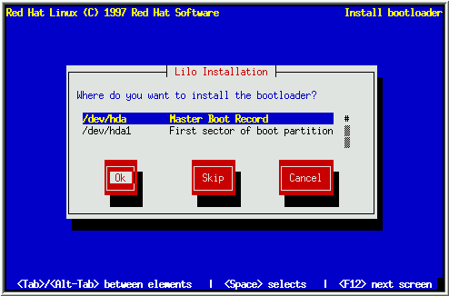 请注意: 如果您选择Skip,您将不能直接启动您的Red Hat Linux 系统, 您必须使用其他启动方式(如软盘启动). 只有当您知道您有启动Red Hat Linux 系统的其他方法时, 您才能不安装LILO!