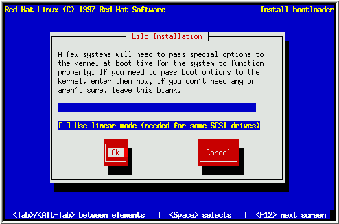 然后, 安装程序会问您是否想为LILO启动命令增加默认选项(见图46). 您输入的任何选项在每次启动时都将被传给Linux内核. 回顾在第2.3.1 节中您计算机的BIOS设置, 如果您发现您的计算机用LBA模式访问硬盘, 请选 Use linear mode. 结束后选择OK并按[Space].