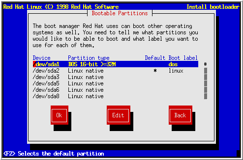 还有一栏叫'Default'. 在这一栏只有一个分区包含一个星号. 如果在启动时没有 用户输入, 则LILO将启动包含星号的那个分区. 最初Red Hat Linux根分区被选为默认 置. 如果您想修改, 用关标键移到您想选的默认分区按[F2]. 星号会移到 选择的分区. 结束后, 选Ok, 并按[Space].