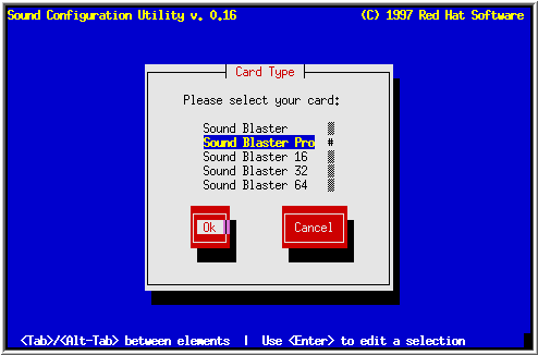 在Red Hat Linux 5.1中是sndconfig, 一个可以正确配置模块化的声音 驱动程序的全屏幕工具.