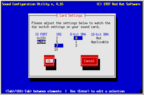 选择完声卡之后, 您将看到类似图50的屏幕. 这时 您可以为声卡做某些设置. 用[Tab] 键选择一个域. 然后用光标键设置的值, 完成后, 选择Ok, 并按[Space].