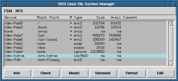 图52所显示的文件系统配置工具可以让您方便的检查和操纵与文件系统有关的诸如文件系统安装点,文件系统类型以及各种选项等等。当操纵大量文件系统时它非常有用。除非您是一位有经验的系统管理员,否则您可能不想自己做这些操作。如果您对这一切很熟悉的话,那么象安装文件系统,卸载文件系统及增添设备之类的活儿,做起来应当是直截了当的事。