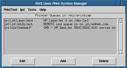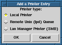 为创建一个新的打印队列, 选择Add. 然后选择要增加的打印机类型.可以使用printtool