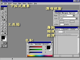 我们开启 Photoshop 3.0 ,会见到如下的视窗画面,