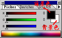 这是 RGB 模式的 Picker 视 窗,我们可以在选择了前 景或背景色之後,直接拉 动调整 选取颜色 0~255。