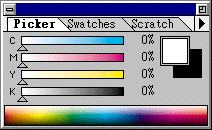 这是CMYK模式的 Picker 视 窗,选择方式和RGB的相 同只是四种颜色是以百分 比的方式调配,可配合色 票选择标准的印刷色彩。 |