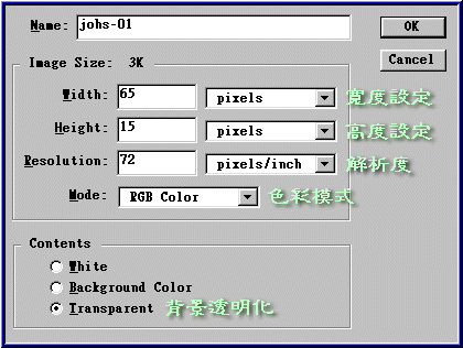开启影像是作图的第一步,您可以按下“下拉式选单 File \ Open开启现有的图档,而选择“ File \ New...”,则是让我们 开启一个新的工作区,按下後会出现以下的功能视窗: