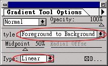 现在,我们用矩形工具把文字的上半部圈选起来。注意!只有 文字部分ㄡ!然後选取渐层工具,将前景色与背景色选成下图 那样。特别注意功能视窗里面被红色圈起来的部份必须一样!